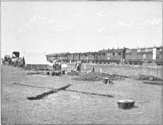 Keywords: The Tale of a Field Hospital 1900 - Face page 4 - Kitchen of the field hospital.png under the photograph reads THE KITCHEN OF THE FIELD HOSPITAL The cross-shaped ditch cut in the ground takes the kettles according to the way of the wind The ambulance train has drawn up Кухня 4-го полевого госпиталя асположенного на станции Ф и 20 км севе нее Эстко та во в емя Англо-бу ской войны 1899 1902 В к естооб азную канаву ставятся котелки в зависимости от нап авления вет а а заднем плане санита ный поезд Фотог афия Ф еде ика Т ивза из его книги «Рассказ о полевом госпитале» 1900 «The Tale of a Field Hospital» cite book Frederick Treves 1900 London Paris New York Melbourne The Tale of a Field Hospital Cassell and Company Limited Face p 4 First Edition October 1900 Reprinted November 1900 December 1900 Retrieved from the Internet Archive http //www archive org/stream/taleoffieldhospi00trev page/n17/mode/2up link extracted from taleoffieldhospi00trev_orig_jp2 tar Modifications by the uploader rotated cropped some dust scratches removed the uncleaned version is available in the file history levels converted to grayscale between 1899 1900 Creator Frederick Treves <ref> cite journal Jeffcoate Stephen The retrieval of Ladysmith 29 July 2000 The Lancet 356 9227 417-421 doi 10 1016/S0140-6736 00 02540-X published in seven episodes in the British Medical Journal and later collected with his own photographs in his book The Tale of a Field Hospital Treves wrote of the </ref> PD-old References references Second Boer War field hospitals Frederick Treves Ambulance trains Ambulances in the 1900s Second Boer War in 1900 British Medical Journal |