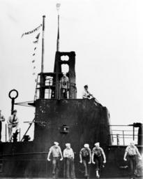 | Keywords: The Tower of USS Wahoo (SS 238).jpg The U S Navy submarine USS Wahoo SS-238 at Pearl Harbor Hawaii USA soon after the end of her third war patrol circa 7 February 1943 Her Commanding Officer Lieutenant Commander Dudley W Morton is on the open bridge in right center The officer standing at left appears to be the Executive Officer Lieutenant Richard H O'Kane <br> Note the broom lashed to the periscope head indicating a clean sweep of enemy targets encountered; the pennant bearing the slogan Shoot the sunza bitches and eight small flags representing claimed sinkings of two Japanese warships and six merchant vessels Note that the forward radar mast mounted in front of the periscope shears has been censored out of this photograph Official U S Navy photo https //www history navy mil/our-collections/photography/numerical-list-of-images/nara-series/80-g/80-G-30000/80-G-35726 html 80-G-35726 from the U S Navy http //www history navy mil Naval History and Heritage Command ca 1943-02-07 U S Navy PD-USGov-Military-Navy USS Wahoo SS-238 Pearl Harbor in World War II Submarine periscopes exterior views Dudley Morton Richard O'Kane |