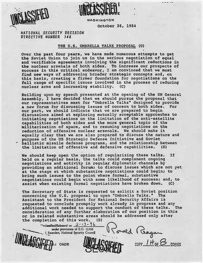 Keywords: The U.S. Umbrella Talks Proposal - NARA - 198278.tif Scope and content General notes 198278 Local identifier President 1981-1989 Reagan National Security Council 1981 - 1989 Ronald Reagan Library NLRR 40 Presidential Drive Simi Valley CA 93065-0600 date 1984 10 26 Record group Collection RR-NSC Numbered National Security Policy Papers 1981 - 1989 Record group ARC 1189 National Security Decision Directives compiled 02/25/1981 - 01/19/1989 Series ARC 198166 File unit File unit ARC Variant control numbers NAIL Control Number NLS-NSC-NSDD-148 yes Other versions <gallery> File The_U S _Umbrella_Talks_Proposal_-_NARA_-_198278 tif tif File The_U S _Umbrella_Talks_Proposal_-_NARA_-_198278 jpg jpg </gallery> NARA-cooperation PD-USGov Presidential Decision Directives Reagan NARA TIF images with categorized JPGs |