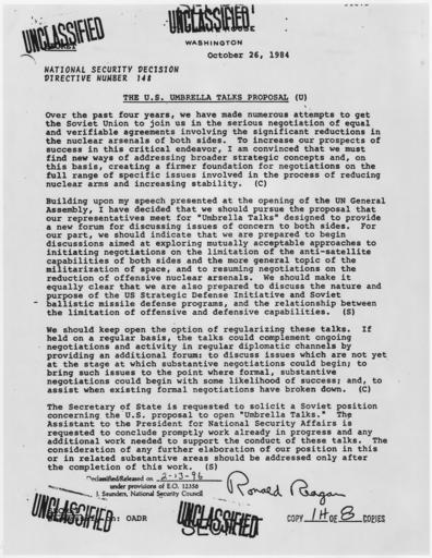 Keywords: The U.S. Umbrella Talks Proposal - NARA - 198278.jpg Scope and content General notes 198278 Local identifier President 1981-1989 Reagan National Security Council 1981 - 1989 Ronald Reagan Library NLRR 40 Presidential Drive Simi Valley CA 93065-0600 date 1984 10 26 Record group Collection RR-NSC Numbered National Security Policy Papers 1981 - 1989 Record group ARC 1189 National Security Decision Directives compiled 02/25/1981 - 01/19/1989 Series ARC 198166 File unit File unit ARC Variant control numbers NAIL Control Number NLS-NSC-NSDD-148 Other versions <gallery> File The_U S _Umbrella_Talks_Proposal_-_NARA_-_198278 tif tif File The_U S _Umbrella_Talks_Proposal_-_NARA_-_198278 jpg jpg </gallery> NARA-cooperation PD-USGov Presidential Decision Directives Reagan |