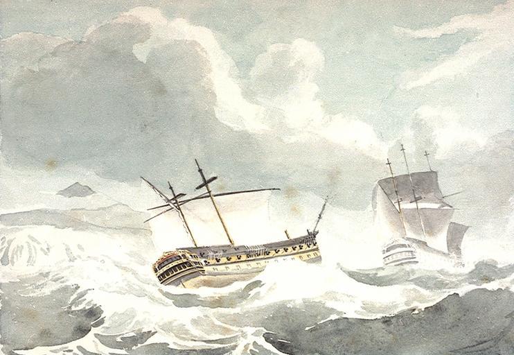 Keywords: The 'Vanguard' disabled and in tow by the Alexander.jpg ru Alexander взял на букси Vanguard кото ый лишился фок-мачты во в емя сильного што ма в Лионском заливе Эпизод п оизошел в самом начале погони эскад ы ельсона за ф анцузами кото ая заве шилась битвой на иле http //www rmg co uk/collections иколас Покок 1810 Arrogant class ship of the line PD-old-100