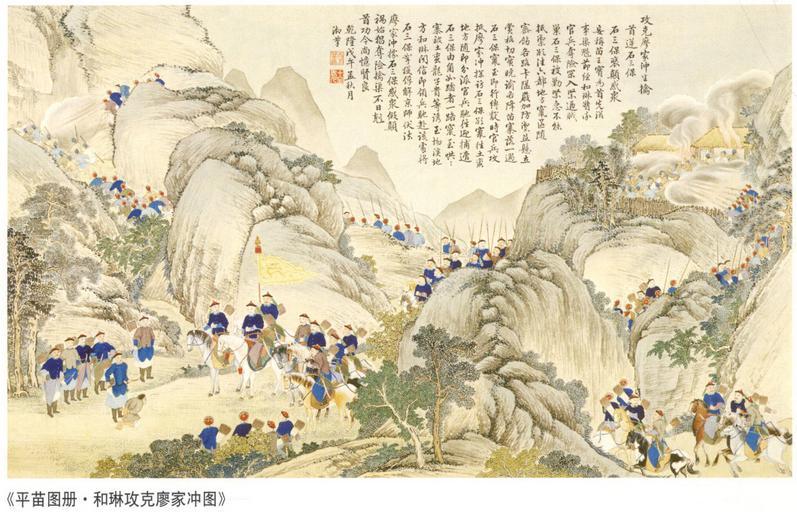 Keywords: The Victorious Battle at Liaojiazhong, culminating in the Beheading of Shishanbao.jpg en A scene of the Chinese Campaign against the Miao Hunan 1795 zh-hans å¹³å®šè‹—ç–†ï¼Œæ”»å…‹å»–å®¶å†²ï¼Œç”Ÿæ“’é¦–é †çŸ³ä¸‰ä¿ http //www battle-of-qurman com cn/e/hist htm late XVIII century A collaboration between Chinese and European painters The Jesuit missionaries involved in producing the drawings in China were Giuseppe Castiglione Jean-Denis Attiret Ignace Sichelbart and Jean Damascene The engravings were executed in Paris under the direction of Charles-Nicolas Cochin of the Académie Royal at the Court of Louis XVI and the individual engravers include Le Bas Aliamet Prevot Saint-Aubin Masquelier Choffard and Launay PD-Art Military of Qing China Ten Great Campaigns Paintings of the Qing Dynasty |