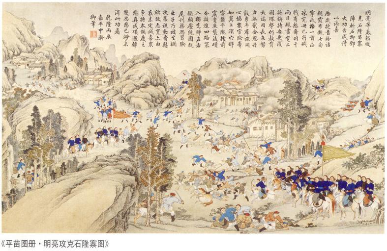 Keywords: The Victorious Battle at Shilong.jpg en A scene of the Chinese Campaign against the Miao Hunan 1795 zh-hans å¹³å®šè‹—ç–†æˆ˜å½¹ä¹‹ä¸ ” ”攻克石隆苗寨 http //www battle-of-qurman com cn/e/hist htm late XVIII century A collaboration between Chinese and European painters The Jesuit missionaries involved in producing the drawings in China were Giuseppe Castiglione Jean-Denis Attiret Ignace Sichelbart and Jean Damascene The engravings were executed in Paris under the direction of Charles-Nicolas Cochin of the Académie Royal at the Court of Louis XVI and the individual engravers include Le Bas Aliamet Prevot Saint-Aubin Masquelier Choffard and Launay PD-Art Military of Qing China Ten Great Campaigns Paintings of the Qing Dynasty |