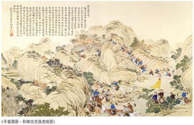 | Keywords: The Victorious Battle to Overcome Huxiao.jpg en A scene of the Chinese Campaign against the Miao Hunan 1795 zh-hans å¹³å®šè‹—ç–†æˆ˜å½¹ä¹‹ä¸ ” ”攻克强虎哨 http //www battle-of-qurman com cn/e/hist htm late XVIII century A collaboration between Chinese and European painters The Jesuit missionaries involved in producing the drawings in China were Giuseppe Castiglione Jean-Denis Attiret Ignace Sichelbart and Jean Damascene The engravings were executed in Paris under the direction of Charles-Nicolas Cochin of the Académie Royal at the Court of Louis XVI and the individual engravers include Le Bas Aliamet Prevot Saint-Aubin Masquelier Choffard and Launay PD-Art Military of Qing China Ten Great Campaigns Paintings of the Qing Dynasty |