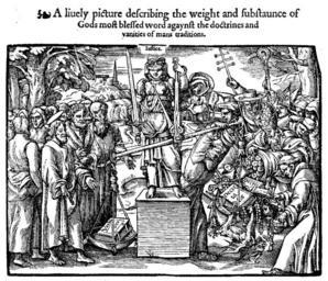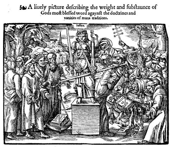 | Keywords: The weight of Gods word against mans traditions.gif en A liuely picture describing the weight and substaunce of Gods most blessed word agaynst the doctrines and vanities of mans traditions The image of Justice reaching judgement with a pair of scales was an ancient formula that was readily adapted to Reformation issues The woodcut depicting Justice demonstrating the weight of 'Verbum Dei' over the book of papal Decretals made its first appearance in the Acts and Monuments in 1576 when it was placed as the closing image of the first half of the work It had first appeared three years earlier on the last page of Foxe's edition of The Whole Works of Tyndale Frith and Barnes printed by Day in 1573 The illustration appears to have been inspired by Foxe himself who described in 1570 an image of a balance weighing on one side 'books condemned'; and on the other 'books allowed' The scales of justice were applied to the contrasting worlds of evangelists whose lived by the word alone untramelled and themselves not weighted down by the opposing popish apparatus of rosaries and pardons and agnus dei and crosses and croziers Those who stand thus liberated at Justice's right hand occupy a light and spacious world thanks to the spiritual freedom they have found They and their church on the distant hill prove their liberation at the hand of Justice blindfold impartial and impervious to devilish antics 'Gods holy truth against manifest idolatry' as Foxe himself put it 1576 http //www johnfoxe org/index php realm more gototype modern type image book 6 The Acts and Monuments Online John Foxe publisher PD-old-100 Foxe's Book of Martyrs Uploaded with UploadWizard Catholic doctrines Anti-Catholicism Bible Sola Scriptura Iustitia Unbalanced scales of justice |