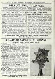 | Keywords: The wonderful new rose hoosier beauty (16202540499).jpg 20 ELLA V BAINES THE WOMAN FLORIST SPRINGFIELD OHIO __ <br> BEAUTIFUL CANNAS I <br> Cannas are called the poor man's Orchid because one may possess a perfect riot of color in his yard <br> or garden for the minimum of both outlay and labor They grow rapidly and bloom luxuriantly through- <br> out a long season requiring merely ordinary hoeing and weeding and they always respond to plenty <br> of water Soak the ground thoroughly Planted in beds of any formal shape in rows or in front of <br> porches and foundation walls their rich tropical foliage and gaudy bloom will repay their care and the <br> insignificant trouble of winter storage <br> NOVELTIES IN CANNAS AND THOSE THAT ARE RARE <br> EUREKA This is the only white flowering Canna <br> that ever amounted to anything It is a good <br> grower free bloomer and pure white in color; <br> large flowers and truss 35 cents <br> FIREBIRD This is by all means the very best red <br> flowered Canna; gigantic trusses of immense flow- <br> ers with petals two and one-half inches to three <br> inches and over across The color is a clear <br> glistening scarlet without streaks or spots of <br> any kind Don't fail to try it 4 feet 35 <br> cents <br> HUNGARIA This Canna catches the eye insistently <br> and demands attention The petals are round and <br> waxy made up into big round trusses Its color <br> forcibly suggests the well-known Paul Neyron <br> Rose and is unquestionably the most attractive <br> and fascinating pink Canna ever produced 3 <br> feet 30 cents <br> KATE F DEEMER The grand flowers open a rich <br> oriole-yellow which gradually gives place to a <br> turkey-red in throat of the flower this in strik- <br> ing contrast with the rest of the blossom which <br> turns almost white Thus two colors of flowers <br> will be on the same stalk at one time This <br> makes a fascinating combination and is the most <br> unusual of all Cannas 4 feet 25 cents <br> MRS ALFRED F CONRAD A most remarkable <br> variety with exquisite salmon-pink flowers of <br> largest size in erect and abundantly furnished <br> heads So freely produced as to keep up a superb <br> showing of its fine bloom for months above the <br> rich green foliage; extra fine 4 feet 30 cents <br> OLYMPIC A captivating shade of orient-red with <br> center flamed a lighter shade as though overcast <br> with a sheen of silver; immense heads of gigantic <br> flowers Superb 4 feet 35 cents <br> PANAMA The color is an attractive rich orange- <br> red with a well-defined edge of bright golden- <br> yellow The flowers are very large and the im- <br> mense spread of the individual blooms coupled <br> with its early free flowering habit makes this <br> Canna noteworthy 30 cents <br> QUEEN HELEN Immense flowers that are as large <br> as the Orchid-flowering Cannas Color golden- <br> yellow evenly and distinctly spotted red This <br> Canna ranks right up with King Humbert We <br> have no hesitancy in saying there is no better <br> Canna grown 4 feet 35 cents <br> ROSEA GIGANTEA Extra large flowers borne in <br> such great abundance that the mass of color is <br> truly amazing; a deep rich rose almost coral- <br> carmine; soft and lovely; one of the most beauti- <br> ful Cannas grown 4 feet 30 cents <br> SPECIAL One Each of the Nine Newer Cannas Costing 2 85 <br> Sent for Only 2 35 <br> STANDARD VARIETIES OF CANNAS <br> 15 Cents Each Except Where Noted <br> CALnfORNIA A pure rich orange or old gold No other <br> Canna color like it 4 feet <br> CRIMSON BEDDER Dazzling crimson-scarlet well dis- <br> played above the foliage A conspicuous bedder 3 feet <br> DAVID HARUM Bronze foliage bright vermilion-scar- <br> let mottled with deep red and with crinkly-edged <br> petals 3 Vi feet <br> DUKE OF MARLBORO One of the darkest flowered <br> Cannas grown; rich crimson-maroon 4 feet <br> FLORENCE VAUGHAJi Rich golden-yellow thickly pep- <br> pered with bright red spots 3V 2 feet <br> GUSTAVE GUMPFER Rich golden-yellow Extra fine <br> 20 cents <br> GLADIATOR A very showy bedding Canna with large <br> flowers of brassy-yellow speckled in bright red The <br> long center petal and lower petals are a solid dark red <br> making a most striking contrast to the predominating <br> yellow 3 feet 20 cents <br> JEAN TISSOT A rich shade of scarlet in large trusses <br> One of the brightest and best 4 feet <br> KING HUMBERT In this grand Canna we have a com- <br> bination of the highest type of flower with the finest <br> bronze foliage It has flowers as large as the Orchid- <br> flowering Cannas Six inches across in trusses of <br> gigantic size; of a brilliant orange-scarlet with bright <br> red markings The foliage is broad and massive of a <br> rich coppery-bronze; bold and effective King Hum- <br> bert is the one ideal Canna 4V 2 feet 20 cents <br> MEPHISTO A brilliant deep rich red; a wonderfully <br> satisfying Canna 3 feet 20 cents <br> METEOR Immense trusses of large rounded flowers <br> well displayed above the massive foliage; brilliant <br> crimson Flowers keep well and are self-cleaning 4 <br> feet 25 cents <br> PILLAR OF FIRE Bright crimson-scarlet Borne in <br> erect spikes like blazing torches; fine 6 feet <br> RICHARD WALLACE A light shade of canary-yellow <br> almost an ecru with delicate flecks of red; a lovely <br> Canna 4 feet <br> SECRETAIRE CHABANNE A distinct and pleasing sal- <br> mon; a fine bedder 3 feet <br> WEST VIRGINIA Intense crimson-scarlet with broad <br> yellow edge 3 feet <br> SPECIAL The Fifteen Standard Cannas <br> Costing 2 55 for 2 10 <br> Canna Florence Vaughan 41856311 131010 64616 Page 20 Text http //www biodiversitylibrary org/page/41856311 1918 10 5962/bhl title 64616 Ella V Baines Firm ; Henry G Gilbert Nursery and Seed Trade Catalog Collection NameFound Mephisto NameConfirmed Mephisto EOLID 27217 NameBankID 4505763 NameFound Orchid NameFound Rosea gigantea Biodiversity Heritage Library Miss Ella V Baines the wo