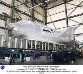 | Keywords: The X-38 lifting body research vehicle, seen here wrapped in a protective material, lowered onto a t DVIDS713632.jpg en The X-38 lifting body research vehicle seen here wrapped in a protective material is lowered onto a truck for shipping from the Dryden Flight Research Center in May 2000 The X-38 Crew Return Vehicle CRV research project is designed to develop the technology for a prototype emergency crew return vehicle or lifeboat for the International Space Station The project is also intended to develop a crew return vehicle design that could be modified for other uses such as a joint U S and international human spacecraft that could be launched on the French Ariane-5 Booster The X-38 project is using available technology and off-the-shelf equipment to significantly decrease development costs Original estimates to develop a capsule-type crew return vehicle were estimated at more than 2 billion X-38 project officials have estimated that development costs for the X-38 concept will be approximately one quarter of the original estimate Off-the-shelf technology is not necessarily old technology Many of the technologies being used in the X-38 project have never before been applied to a human-flight spacecraft For example the X-38 flight computer is commercial equipment currently used in aircraft and the flight software operating system is a commercial system already in use in many aerospace applications The video equipment for the X-38 is existing equipment some of which has already flown on the space shuttle for previous NASA experiments The X-38's primary navigational equipment the Inertial Navigation System/Global Positioning System is a unit already in use on Navy fighters The X-38 electromechanical actuators come from previous joint NASA U S Air Force and U S Navy research and development projects Finally an existing special coating developed by NASA will be used on the X-38 thermal tiles to make them more durable than those used on the space shuttles The X-38 itself was an unpiloted lifting body designed at 80 percent of the size of a projected emergency crew return vehicle for the International Space Station although two later versions were planned at 100 percent of the CRV size The X-38 and the actual CRV are patterned after a lifting-body shape first employed in the Air Force-NASA X-24 lifting-body project in the early to mid-1970s The current vehicle design is base lined with life support supplies for about nine hours of orbital free flight from the space station It's landing will be fully automated with backup systems which allow the crew to control orientation in orbit select a deorbit site and steer the parafoil if necessary The X-38 vehicles designated V131 V132 and V-131R are 28 5 feet long 14 5 feet wide and weigh approximately 16 000 pounds on average The vehicles have a nitrogen-gas-operated attitude control system and a bank of batteries for internal power The actual CRV to be flown in space was expected to be 30 feet long The X-38 project is a joint effort between the Johnson Space Center Houston Texas JSC Langley Research Center Hampton Virginia LaRC and Dryden Flight Research Center Edwards California DFRC with the program office located at JSC A contract was awarded to Scaled Composites Inc Mojave California for construction of the X-38 test airframes The first vehicle was delivered to the JSC in September 1996 The vehicle was fitted with avionics computer systems and other hardware at Johnson A second vehicle was delivered to JSC in December 1996 Flight research with the X-38 at Dryden began with an unpiloted captive-carry flight in which the vehicle remained attached to its future launch vehicle Dryden's B-52 008 There were four captive flights in 1997 and three in 1998 plus the first drop test on March 12 1998 using the parachutes and parafoil Further captive and drop tests occurred in 1999 In March 2000 Vehicle 132 completed its third and final free flight in the highest fastest and longest X-38 flight to date It was released at an altitude of 39 000 feet and flew freely for 45 seconds reaching a speed of over 500 miles per hour before deploying its parachutes for a landing on Rogers Dry Lakebed In the drop tests the X-38 vehicles have been autonomous after airlaunch from the B-52 After they deploy the parafoil they have remained autonomous but there is also a manual mode with controls from the ground NASA Identifier NIX-EC00-0147-30 2009-09-23 Glenn Research Center https //www dvidshub net/image/713632 713632 2012-10-10 17 29 WASHINGTON DC US PD-USGov Langley Research Center Images from DoD uploaded by Fæ |