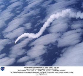 | Keywords: The X-43A-Pegasus combination dropped into the Pacific Ocean after losing control early in the first DVIDS690943.jpg en The first X-43A hypersonic research aircraft and its modified Pegasus booster rocket were carried aloft by NASA's NB-52B carrier aircraft from Dryden Flight Research Center at Edwards Air Force Base Calif on June 2 2001 for the first of three high-speed free flight attempts About an hour and 15 minutes later the Pegasus booster was released from the B-52 to accelerate the X-43A to its intended speed of Mach 7 Before this could be achieved the combined Pegasus and X-43A stack lost control about eight seconds after ignition of the Pegasus rocket motor The mission was terminated and explosive charges ensured the Pegasus and X-43A fell into the Pacific Ocean in a cleared Navy range area A NASA investigation board is being assembled to determine the cause of the incident Work continues on two other X-43A vehicles the first of which could fly by late 2001 Central to the X-43A program is its integration of an air-breathing scramjet engine that could enable a variety of high-speed aerospace craft and promote cost-effective access to space The 12-foot unpiloted research vehicle was developed and built for NASA by MicroCraft Inc Tullahoma Tenn The booster was built by Orbital Sciences Corp at Chandler Ariz The X-43A flights are the first actual flight tests of an aircraft powered by a scramjet engine capable of operating at hypersonic speeds above Mach 5 or five times the speed of sound Some 90 minutes after takeoff the Pegasus will launch from a B-52 rocketing the X-43A to Mach 7 at 95 000 feet altitude or Mach 10 at 105 000 feet altitude The X-43A will be powered by its revolutionary air-breathing supersonic-combustion ramjet or scramjet engine The X-43A will then fly a pre-programmed trajectory conducting aerodynamic and propulsion experiments as it descends until it splashes into the Pacific Ocean NASA Identifier NIX-EC01-0182-11 2009-12-10 Glenn Research Center https //www dvidshub net/image/690943 690943 2012-10-10 12 30 WASHINGTON DC US PD-USGov Edwards Air Force Base Images from DoD uploaded by Fæ Boeing X-43 |