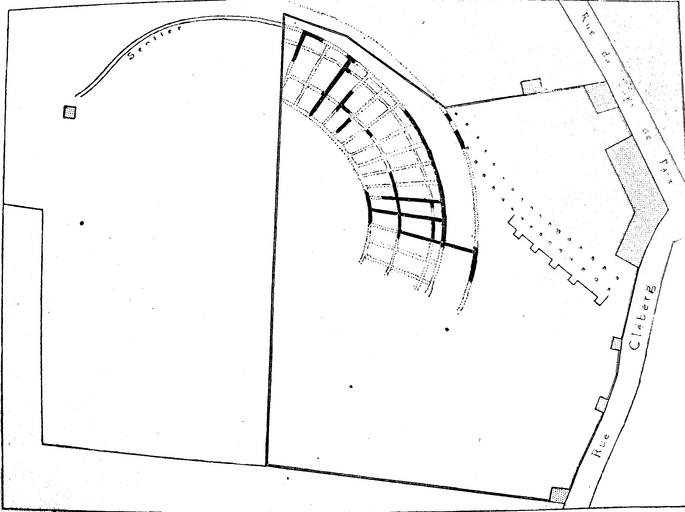 | Keywords: Theatre antique Lyon -plan Steyert 1885.JPG fr Plan des sous-structures du théâtre antique de Lyon situées dans le clos Lafon en noir murs observés en pointillé tracés extrapolés Publié par André Steyert A gauche sentier dans le clos de la Compassion non sondé Nouvelle Histoire de Lyon en 3 volumes 1895-1899 tome I p 271 André Steyert 1830-1904 1895 Théâtre romain de Fourvière Maps of Lugdunum PD-old-100-1923 1904 | ||||