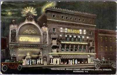 | Keywords: vcu libraries vculibraries vcu digital collections vcudigitalcollections Description: The 'Bijou Family Theatre' and 'The Orpheum' offer an attractive and novel electrical illumination display, and the popularity of their amusement features is attested by the crowds that thong their doors whenever they are opened to the public. The two play-houses occupy a portion of the old Swan Tavern, one of the most celebrated hostelries of the Richmond of by-gone days. Manufacturer: Southern Bargain House, Richmond, Va. Date Postmarked: Not postmarked. Rights: This item is in the public domain. Acknowledgement of the Virginia Commonwealth University Libraries as a source is requested. Reference URL: dig.library.vcu.edu/u?/postcard,604 Collection: Rarely Seen Richmond: Early twentieth century Richmond as seen through vintage postcards Description: The 'Bijou Family Theatre' and 'The Orpheum' offer an attractive and novel electrical illumination display, and the popularity of their amusement features is attested by the crowds that thong their doors whenever they are opened to the public. The two play-houses occupy a portion of the old Swan Tavern, one of the most celebrated hostelries of the Richmond of by-gone days. Manufacturer: Southern Bargain House, Richmond, Va. Date Postmarked: Not postmarked. Rights: This item is in the public domain. Acknowledgement of the Virginia Commonwealth University Libraries as a source is requested. Reference URL: dig.library.vcu.edu/u?/postcard,604 Collection: Rarely Seen Richmond: Early twentieth century Richmond as seen through vintage postcards |