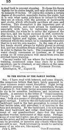 | Keywords: TheFamilyDoctorAug31 1889page10.png 10 a steel busk to prevent stooping It clasps his figure tightly for its entire length and only allows his waist to measure 18 inches Of course this entails a certain degree of discomfort especially during the night but it is only what many girls have to submit to while they are at school with the addition of backboards and stocks which effectually sacrifices all ease and freedom This discomfort is the important part of corset discipline and must always be maintained especially with boys by tightening their stays periodically for when he is under the regime of the stay-lace and his figure enclosed in stiff unstretchable stays he is easily made to submit to its being squeezed tighter and tighter and by the irksome restraint which this entails he is constantly reminded that he is not his own master In the case of a girl her hands should always be tightly gloved in strong kid and her shoulders firmly strapped back by braces in order to flatten the back The compression of her waist should commence at fourteen as if begun young no ill consequences will ensue from even the strictest figure training Can any reader tell me where the books on figure training mentioned some time since by a correspondent can be obtained or any others on the same subject -Yours c FINISHED FIGURE Kensington W August 13 <center>TO THE EDITOR OF THE FAMILY DOCTOR </center> SIR -I have read with interest and some disgust the numerous letters that have lately appeared in your columns anent corset discipline Tight lacing to gratify personal vanity I can understand though I deplore it; but tight lacing as a punishment seems to me to be senseless barbarous and injurious to health A sentence in the letter of Experimentum Crucis in your last suggests a more excellent way both as a means of discipline and a promoter of good carriage I refer to the old-fashioned stocks and backboard used in the last generation to correct the bad habits alas still prevalant of turning in the toes and stooping By the backboard I do not mean the steel backboard and collar--that fearful instrument of our grandmothers' days--but the more modern wooden instrument of that name Perhaps some of your fair readers can give us their experience on this point and tell us where these necessary articles can be procured or mention any schools where they are still in use Such information would be useful to many of us who are like myself July 1 1889 OLD-FASHIONED Tightlacing The Family Doctor 1889 Image TheFamilyDoctorAug31_1889page9 png from Finished Figure; from Old-Fashioned PD-Art Artworks missing infobox template |