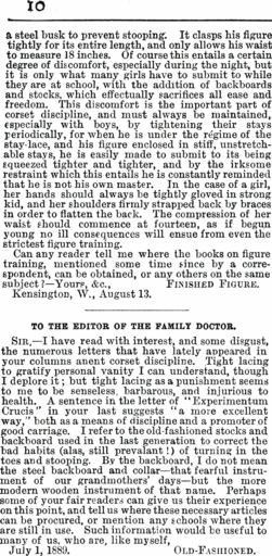 Keywords: TheFamilyDoctorAug31 1889page10.png 10 a steel busk to prevent stooping It clasps his figure tightly for its entire length and only allows his waist to measure 18 inches Of course this entails a certain degree of discomfort especially during the night but it is only what many girls have to submit to while they are at school with the addition of backboards and stocks which effectually sacrifices all ease and freedom This discomfort is the important part of corset discipline and must always be maintained especially with boys by tightening their stays periodically for when he is under the regime of the stay-lace and his figure enclosed in stiff unstretchable stays he is easily made to submit to its being squeezed tighter and tighter and by the irksome restraint which this entails he is constantly reminded that he is not his own master In the case of a girl her hands should always be tightly gloved in strong kid and her shoulders firmly strapped back by braces in order to flatten the back The compression of her waist should commence at fourteen as if begun young no ill consequences will ensue from even the strictest figure training Can any reader tell me where the books on figure training mentioned some time since by a correspondent can be obtained or any others on the same subject -Yours c FINISHED FIGURE Kensington W August 13 <center>TO THE EDITOR OF THE FAMILY DOCTOR </center> SIR -I have read with interest and some disgust the numerous letters that have lately appeared in your columns anent corset discipline Tight lacing to gratify personal vanity I can understand though I deplore it; but tight lacing as a punishment seems to me to be senseless barbarous and injurious to health A sentence in the letter of Experimentum Crucis in your last suggests a more excellent way both as a means of discipline and a promoter of good carriage I refer to the old-fashioned stocks and backboard used in the last generation to correct the bad habits alas still prevalant of turning in the toes and stooping By the backboard I do not mean the steel backboard and collar--that fearful instrument of our grandmothers' days--but the more modern wooden instrument of that name Perhaps some of your fair readers can give us their experience on this point and tell us where these necessary articles can be procured or mention any schools where they are still in use Such information would be useful to many of us who are like myself July 1 1889 OLD-FASHIONED Tightlacing The Family Doctor 1889 Image TheFamilyDoctorAug31_1889page9 png from Finished Figure; from Old-Fashioned PD-Art Artworks missing infobox template |