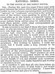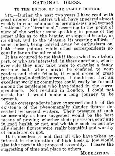 | Keywords: TheFamilyDoctorFeb9 1889page375.png RATIONAL DRESS TO THE EDITOR OF THE FAMILY DOCTOR SIR --During the past two years I have read with great interest the letters which have appeared almost weekly in your columns conrerning dress and termed rational or irrational according to the point of view of the writer; some speaking in praise of the corset alike as to the beauty or supposed beauty of its effect and to the pleasure its wearing affords-- some indeed being carried away hy enthusiasm on both these points while other correspondents go equally far on the other side It has occurred to nle that if those who have taken part or who are intereste in these questious whatever side they may take were to organise a fancy costume ball which might he confined to your readers and their friends it would prove of great interest and a decided succsess I doubt not that an excellent working committee could easily be formed among the gentlemen who have joined in the correspondence Not residing in London I could not assist but I would Inake a long journey to be present Some correspondents have expressen doubts of the existence of the phenomenally slender figures descrihed by several writers Their presence at such an assembly as here suggested would be the best means of proving whether their possessors continue in good health or not and whether such exceptionally slender figures were really beautiful and worthy of emulation or not It is needless to add that an who have taken an interest in the question of high heels v low would also take part in the proposed assembly I leave the suggesting of time and place to others MODERATION Tightlacing The Family Doctor 1889 from Moderation PD-Art Artworks missing infobox template |