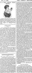 | Keywords: TheFamilyDoctorNov16 1889page187.png Nov 16 1889 E R TICE'S DENTAL TOILET MIRROR By means of this ingeniously-contrived little instrument all persons can examine their own teeth with no kind of difficulty It is a most useful article and enables parents to see to their children's teeth - Wholesale Agents for the United Kingdom and British Colonies are Messrs Lynch Co Aldersgate Street London <center> ATROPHY - 0 - </center> ATROPHY Wasting may be either general or local General atrophy is in one sense natural to advanced life when the powers of nutrition being diminished the muscles the brain and the organs generally shrink There may be fat but at the same time much atrophy of the other bodily components Atrophy occurring earlier in life without obvious cause ought to be regarded suspiciously When an individual without departing from ordinary habits begins to lose flesh the cause ought to be looked for and if the change continues the person should be submitted to a thorough medical examination and the existence or not of incipient disease if possible ascertained In young children atrophy occurs as a consequence of faulty digestion most frequently from improper feeding; it is also the result of a diseased condition of the glands of the belly through which the nutrient portion of the food passes on its way to the general circulation For this condition cod-liver oil is the remedy given in teaspoonful doses twice a day to an infant of six or eight months old and the same quantity well rubbed into the skin of the abdomen night and morning Some medicines such as iodine have the power of causing local or even general atrophy Local atrophy is liable to occur from various causes Whatever diminishes the supply of blood to a part will cause it to waste Pressure on the main artery of a limb obliteration of the smaller vessels of a part by previous inflammation disuse of a member from paralysis or any other cause are all followed by diminution in slize of the part affected <center> CORRESP0NDENCE -- 0 -- DOES TIGHT LACING REALLY EXIST TO THE EDITOR OF THE FAMILY DOCTOR </center> SIR -It is now about a year since you favoured me by inserting a letter upon the absorbing subject of tight lacing and high heels Of the latter I shall have something to say in another letter if you will give me space in your columns The former after your article headed as above is more on the tapis Since last year I have had a much better opportunity of seeing the action of tight stays upon an average figure for have married one of your correspondents who under the title of Moderation has written several letters that you have inserted in which she gave her opinion and personal experience I am myself an intense admirer of a tiny waist and that it should be artificially produced by tight lacing only adds to its charm Yet experience has shown me that great care is requisite even for quite moderate lacing or injury will be done The way it injures is simply through lowering the system and producing anæmia This itself brings many evils in its train but indigestion is the most likely one when tight lacing is indulged in If this becomes chronic it is a most difficult thing to cure This was happening to my better half and she had to let herself out from 19 to 22 inches with the result that the anæmia has disappeared and the indigestion is almost well It was chiefly for the want of proper air and exercise that the anæmia came on all newly-married ladies are so enamoured of their first house it is difficult to get them out but there is no doubt it was favoured by lacing even to that moderate tightness she was used to But the cap was given to it all by trying to sleep in stays that soon brought on irritation of the mucous membrane Corset wearing at night may be all very well for young girls but for women of twenty-nine like my wife it is somewhat risky There is NO doubt than many girls and young women can well bear having their figures reduced permanently and yet remain perfectly healthy but it must be carefully and scientifically done A well-known society belle who may be seen at most of the private views of picture galleries has had her figure thus trained to 18 inches and an exquisite shape though she is very tall and fully formed Yet she is always in the most robust health is witty and vivacious; quite different to the sickly stupid person the hygienic school would have us believe all tight-lacers are Of course this is a very different size to the 14 inches mentioned in your article as possessed by the young lady at the corsetiers It would be most interesting if you could obtain a photo of this young lady showing her waist at this size and reproduce it as a block with the face altered of course by the Meissenbach or some analogous process I am sure there are many of your readers who would be most interested never having like myself seen a waist so small in real life The number would be sure to have an enormous sale if the pose made a pretty picture Even without the numerous letters from your small-waisted correspondents your article conclusively proves that tight lacing does exist and when it does so without injury to the tight-laced I think it is a thing to be glad of We are so differently made that what is harmless and even beneficial for one is very injurious to another All young ladies cannot tight lace but a very large number can do so with impunity However like everything else it must be done properly in order to succeed The amount of reduction that can be effected varies greatly with the individual but lies between 6 and 9 inches below Nature; seldom is it possible to be less Some of the healthiest women I know though they have not extreme tenuity yet have beautiful figures and a waist very much below their natural size Everyone who has any pretensions to being well and fashionably dressed have waists reduced 3 or 4 inches though often they do not know it themselves The civilised lives led by the Upper Ten do no