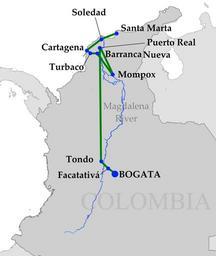 Keywords: TheGeneralinhisLabyrinth.png Route of Simón Bolívar as described in The General in his Labyrinth by Gabriel García Márquez self-made map base from Image Magdalena_localizacion png 2008 Yomangani PD Maps showing 19th-century history