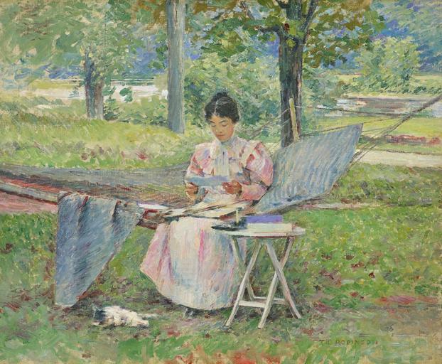 | Keywords: Theodore Robinson - Correspondence (1895).jpg Artwork Creator Theodore Robinson 1895 oil canvas cm 45 7 55 9 institution Minnesota Marine Art Museum accession number http //www mmam org/Visit/Collections/Impressionism-and-Post-Impressionism Minnesota Marine Art Museum object history Macbeth Gallery New York 1913<br/>H F Field<br/>Sale Estate of Thomas R Ball New York and Francis White Baltimore et al American Art Association New York March 13-14 1919 lot 132 illustrated as Girl in a Hammock Reading <br/>Holland Galleries<br/>Sale Hon James Smith et al American Art Association New York November 28 1924 lot 42<br/>M Knoedler Co New York<br/>Sale Estate of F W Woolworth Edwin Baldwin et al American Art Association New York January 5 1927 lot 146 illustrated as Lady Reading <br/>David Roberts<br/>Jerome Konheim New York 1946<br/>Tessie Konheim New York by descent as of 1960 <br/>Doris Konheim Rubin and Harry Rubin New York by descent as of 1982 <br/>Private Collection Rubin family member credit line on loan from a private collection exhibition history New York Society of American Artists Catalogue of the 18th Exhibition 1896 March-May 1896 no 213 p 55<br/> Brooklyn New York The Brooklyn Museum The Brooklyn Institute of Arts and Sciences Theodore Robinson 1852-1896 November 1946-January 1947 no 46 p 60 illustrated pl XXXVI<br/>2014 Minnesota Marine Art Museum Impressionism Post-Impressionism Working Towards a Closer Relationship with Nature and Life TH ROBINSON ~ lower right signature http //www sothebys com/en/auctions/ecatalogue/2012/american-art-n08911/lot 20 lotnum html Sotheby's New York 29 November 2012 lot 20 PD-old-auto-1923 1896 Theodore Robinson Minnesota Marine Art Museum Portrait paintings of women 1890s portrait paintings Females reading in art Reading letters Images from Sotheby's |