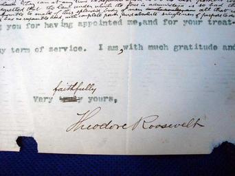 | Keywords: Theodore Roosevelt resignation 005 (signature).jpg This is a closeup of the signature on page five of Theodore Roosevelt's resignation letter to the Mayor of New York ceding his position as President of the New York Police Department on 17 April 1897 The text is digitized at s Resignation letter Roosevelt Scans are taken from an auction of the letter http //cgi ebay com/THEODORE-ROOSEVELT-Letter-of-Resignation-NYPD_W0QQitemZ320000215450QQihZ011QQcategoryZ33776QQrdZ1QQcmdZViewItem non-permanent online page Additional important information regarding source This letter was stolen in 1974 This letter was in the possession of Margaret Daisy Suckley Daisy was confidant to Franklin Roosevelt a sixth cousin and archivist at the Hyde Park Presidential Library This may have been the source of the revised draft letter Daisy gave it to Francis and Mary Crowell Frank Crowell framed the letter and displayed it in his office at his residence at 17 Mill Street in Rhinebeck NY From Francis and Mary Crowell the letter passed to Janet Montgomery Baldwin Janet T Baldwin lived with Frank and Mary From Janet it passed to Anne B Cox daughter of Janet and then to Michael and Charles Cox sons of Anne residing at 3 N Randolph Ave Poughkeepsie NY In 1973 worried about the safety of the letter Michael folded the letter around a piece of cut cardboard and sealed it behind a framed envelope with an uncut pair of black Washington stamps that hung in a frame on the wall of Cox's bedroom The letter with black Washington stamps was posted circa 1850 and written on blue linen paper The letter was between Eugene Lynch and Ogden Lynch ancestors of Francis Crowell concerning their dry-goods and mining supply trade in Coloma CA The Lynch letter and the Roosevelt letter hidden behind it along with other antiquities including original bills of lading from the Flying Cloud referenced in Lynch's letter were stolen in June 1974 by coworkers who were visiting Anne Cox Anne was packing and making preparations to move her family to California within days of the theft The theft was witnessed by a friend of Michael The friend 15 years old challenged the thieves when they attempted to remove some of Friend's personal property He then noticed articles the thieves had placed in their car but when challenged by the friend the thieves told him the articles were theirs and the friend believed them The full significance was not understood until Michael Cox reported the theft of the article upon arrival and unpacking in California Cox was a minor and the thieves vehemently denied the theft and Cox was now in California so the police did not follow up The image here clearly shows the fold lines of the frame in which Michael Cox placed it 1897-04-17 Theodore Roosevelt Theodore Roosevelt resignation police commissioner 1919 |