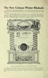 | Keywords: Theodosia B. Shepherd Co (16570540377).jpg The New Crimson Winter Rhubarb <br> Everbearing Crimson Winter Rhubarb This valuable and wonderful plant was in- <br> troduced by Luther Burbank of Santa Rosa Cal who is known the world over as the <br> Wizard of Horticulture having produced more new fruits and plants than any other <br> living man <br> It has a delightful flavor quite different from common rhubarb and an entire ab- <br> sence of the fibrous strings common to the old variety It is fine grained and requires no <br> stringing so there is no waste It fills a long-felt want and gives for a comparatively <br> low price a delightful dish when all other fruits are scarce and high priced For sauces <br> pies jelly marmalade fruitade and wine it is equally valuable <br> its <br> fe T <br> Diploma and Gold Medal Awarded to Us for Crimson Winter Rhubarb <br> Strong plants 50c each; 2 25 per y 2 dozen; 4 25 per dozen; 25 per 100; 50 at 100 <br> rates Medium size 25d each; 2 50 per dozen; 15 per 100; 50 at 100 rates; small by <br> mail 1 50 dozen; 6 00 per 100; 40 00 per 1000 Special prices given to those who <br> wish to grow rhubarb in large quantities for shipping Send for special Rhubarb pam- <br> phlet 41834666 130851 64483 Cover http //www biodiversitylibrary org/page/41834666 1906 10 5962/bhl title 64483 Henry G Gilbert Nursery and Seed Trade Catalog Collection ; Theodosia B Shepherd Company Biodiversity Heritage Library Theodosia B Shepherd Co Garden Stories Catalogs Nurseries Horticulture Plants Ornamental Seed industry and trade Seeds Theodosia B Shepherd Company Trade catalogs U S Department of Agriculture National Agricultural Library bhl page 41834666 dc identifier http //biodiversitylibrary org/page/41834666 bhlGardenStories Crimson winter rhubarb BHLinbloom taxonomy common Crimson Winter Rhubarb nurseries horticulture plants ornamental theodosia b shepherd company u s department of agriculture national agricultural library bhlgardenstories bhlinbloom taxonomy common crimson winter rhubarb Information field Flickr posted date ISOdate 2015-03-10 CC-BY-2 0 BioDivLibrary https //flickr com/photos/61021753 N02/16570540377 2015-08-24 01 53 47 cc-by-2 0 PD-old-70-1923 Photos uploaded from Flickr by Fæ using a script Theodosia B Shepherd Company catalogs |