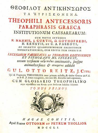 | Keywords: Theophili paraphrasis institutionum graeca - WIllhelm Otto Reitz - 1751.jpg en Theophili paraphrasis institutionum graeca Front page of the translation made by WIllhelm Otto Reitz Hague 1751 Theophili paraphrasis institutionum graeca Greek Θεόφιλου αντικήνσορος τα ινστιτούτα was a collection of byzantine legal texts from the time of Justinian I 5th/6th c composed by Theophilus the Antecessor el Θεόφιλου αντικήνσορος τα ινστιτούτα Πρώτη σελίδα της μετάφρασης του Βίλχελμ Όττο Ράιτς Χάγη 1751 Το Θεόφιλου αντικήνσορος τα ινστιτούτα ήταν μια συλλογή νομικών κειμένων α ό τον καιρό του Ιουστινιανού Α´ 5ος/6ος αιώνας τα ο οία συντάχθηκαν α ό τον Θεόφιλο τον Αντικήνσορα 2015-04-24 http //lawlibrary wm edu/wythepedia/index php/File TheophiliAntecessoris1751 jpg Wilhelm Otto Reitz other versions Custom license marker 2015 04 24 PD-old-100 Uploaded with UploadWizard Books in Greek Books in Latin |