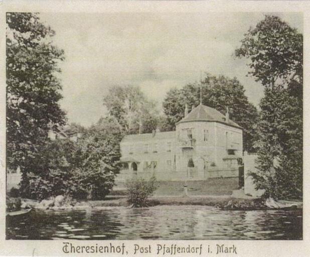 | Keywords: Theresienhof Bad Saarow um 1900.jpg Theresienhof um 1900 Theresienhof ist heute ein Wohnplatz der Gemeinde Bad Saarow im Landkreis Oder-Spree in Brandenburg Das in der Bildzeile genannte Pfaffendorf ist ein Ortsteil von Rietz-Neuendorf Hervorgegangen aus der Wassermühle Pieskow am Ostufer des Scharmützelsees wurde das landwirtschaftliche Anwesen unter dem Namen Theresienhof erstmals 1851 erwähnt Zu den bekannten Privatbesitzern zählten die Schauspielerin Ernestine Wegner und die Zirkusfamilie Renz Seit 1918 im Eigentum wechselnder Gesellschaften und Institutionen wurde der Theresienhof seither als Erholungs- und Ferienheim oder Ausbildungsstätte genutzt Im Jahr 2008 wurde das oft als Schloss bezeichnete Gebäude abgerissen Unter dem Namen Schlosspark Bad Saarow wurde auf dem Gelände des ehemaligen Hofs seit 2008 ein Feriendorf mit rund 140 Ferienhäusern und -Wohnungen im skandinavischen Stil angelegt Theresienhof about 1900 Theresienhof is today a part settlement estate; german Wohnplatz of Bad Saarow District Oder-Spree Brandenburg Germany The in the image mentioned Pfaffendorf is a part of Rietz-Neuendorf; it was in this time the post office for Theresienhof Originating as the watermill Pieskow at the eastern bank of the Scharmützelsee the Theresienhof was an agricultural establishment for a long time Under the name Theresienhof it was first mentioned in documents in 1851 Since 1918 it was used as recreation resort holiday home or educational training center In 2008 the main building a villa or manor house often referred to as a castle was demolished A holiday village named Schlosspark Bad Saarow with about 140 holiday houses and accomodations in scandinavian style has been created on the site of the Theresienhof since 2008 Martin Kramberg http //www spd-scharmuetzelsee de/index php mod content menu 9 page_id 3161 Der Theresienhof in Bad Saarow “ Gerüchte und viele Irrtümer In spd-scharmuetzelsee de 16 September 2009 ~ 1900 Author Theresienhof Bad Saarow Castles and manors in Landkreis Oder-Spree PD-old |