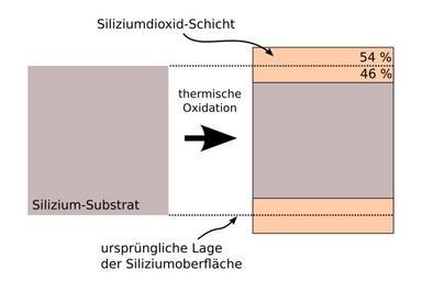 Keywords: Thermische Oxidation von Silizium (Schema).svg en Consumption of silicon during thermal oxidation de Verbrauch von Silizium bei der thermischen Oxidation own Cepheiden 2010-05-18 Thermal oxidation