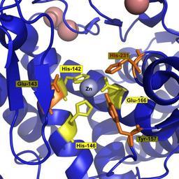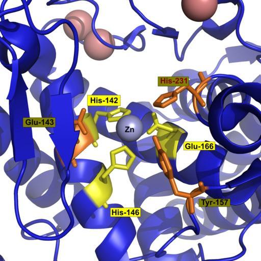 | Keywords: Thermolysin detail 2A7G.png en detail of ribbon model of thermolysin with zinc binding amino acids in yellow other amino acids important for catalysis in orange; zinc is light blue the six calcium are in salmon From PDB 2A7G Ref C Mueller-Dieckmann et al 2005 On the routine use of soft X-rays in macromolecular crystallography Part III The optimal data-collection wavelength Acta Crystallogr D Biol Crystallogr 61 1263-1272 PMID 16131760 DOI 10 1107/S0907444905021475 adapted from http //www pdb org/pdb/files/2a7g pdb using PyMOL Ayacop 2008-11-14 http //www ebi ac uk/pdbsum/2A7G Thermolysin Protein structures from PDB |