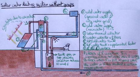 | Keywords: Thermosiphon solar water heating system 2.JPG en A schematic of a thermosiphon solar water heating system Thermosiphon systems do not have pumps increasing durability and decreasing operation costs The schematic was based on a schematic by EERE http //www eere energy gov/de/solar_hotwater html ;schematic 3 Note that the convection effect between 6 and 10 was eliminated because of the fact that the water pressure was removed due to the fact that 6 is open at the top connection to outside air via hole This makes sure that the force of gravity takes effect at the water in the pipe after 10 driving down the hot water The water is again lifted due to the convection effect as the second pipe extends down into the hot water unlike the first one The valves themselves will need to be computer operated connected to sensors as noted in schematic 6 is ideally electrically heated Own KVDP 2009-09-08 Thermosiphon solar water heating systems Solar heating schemas and diagrams Taken with Konica Minolta Dimage Z6 |