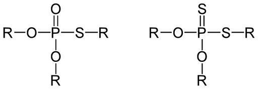 Keywords: Thiophosphorsäureester Dithiophosphorsäureester.svg de Thiophosphorsäureester links und Dithiophosphorsäureester rechts Own Yikrazuul 2008-07-29 Esters Phosphorus-sulfur compounds
