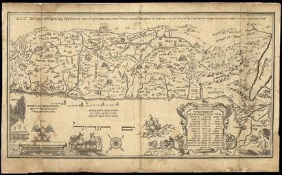| Keywords: This (is being produced) so that all can know the route of the travels (of the Israelites) 40 years in the desert (through) the width and length of the Holy Land from the Nile to the city of Damascus, WDL2887.png Artwork ru Ав аам Бен-Якоб XVII век fr Abraham ben Jacob 17ème siècle en Abraham ben Jacob 17th century zh 亚伯拉罕· ·雅各布 17 世纪 pt Abraham ben Jacob Século 17 ar ابراهيم بن يعقوب القرن السابع عشر es Abraham ben Yacov siglo XVII ru Ка та создается чтобы все знали ма ш ут блужданий из аильтян в течение 40 лет по пустыне во всех п еделах Святой Земли от ила до го ода Дамаск от долины А нона до С едиземного мо я Здесь каждое колено получило своей надел земли fr Ceci est créé afin que tous puissent connaitre la route des voyages des Israélites 40 ans dans le désert par la largeur et la longueur de la Terre Sainte du Nil à la ville de Damas de la vallée de l'Arnon à la mer Méditerranée et sur elle chaque tribu s'est vue attribuer sa propre portion de terre en This is being produced so that all can know the route of the travels of the Israelites 40 years in the desert through the width and length of the Holy Land from the Nile to the city of Damascus from the Arnon Valley to the Mediterranean Sea and in it each individual tribe was given its own portion of the land zh 图(制 中),出版后 人 能了解(以色列人)40 年 沙漠中的旅行路线,即从尼罗河到大马士 城,从阿尔河谷到 中海(穿越)整个 ,以及每个部落 这片 上拥 的部分 pt Isto está sendo produzido para que todos possam conhecer a rota das viagens dos Israelitas 40 anos no deserto através da largura e da extensão da Terra Santa desde o Nilo até a cidade de Damasco desde o Vale de Arnon até o Mar Mediterrâneo e com isso cada tribo recebeu sua própria porção de terra ar يجري إنتاج هذا لكي يتمكن الجميع من معرفة طريق أسفار الإسرائيليين لمدة 40 سنة في الصحراء عبر عرض وطول الأرض المقدسة من النيل إلى مدينة دمشق، ومن وادي أرنون إلى البحر الأبيض المتوسط، وفيها كان لكل قبيلة جزئها الخاص من الأرض ru Эта медная г авю а Святой Земли 1695 года является одной из самых анних печатных ка т на ив ите Создателем ка ты был п озелит Ав аам Бен-Якоб кото ый положил в основу своей аботы более д евнюю ка ту К истиана ван Ад ихема 1533-1585 гг Его ка та была включена в Амсте дамскую Хаггаду а ка ту нанесены библейские иллюст ации с еди кото ых изоб ажение Ионы в ч еве кита ко абли ца я Соломона везущие кед овый лес для ст оительства х ама в Ие усалиме а также пчелиные улья и ко овы символизи ующие молоко и мед Земли Обетованной Амсте дамская Хаггада пе вая Хаггада включавшая г авю ы на меди п ете пела множество пе еизданий и асп ост анилась по всей Ев опе <br>Библия Ветхий Завет fr Cette gravure sur cuivre de 1695 de la Terre sainte est l'une des toutes premières cartes imprimées en Hébreu La carte fut dessinée par Abraham Ben-Jacob converti au judaïsme sur la base d'une carte précédente par Christiaan van Adrichem 1533-85 et reproduite dans l'Haggadah d'Amsterdam La carte se compose d'illustrations bibliques parmi lesquelles des représentations de l'histoire de Jonas et de la baleine le convoi du Roi Salomon transportant les cèdres pour la construction du temple de Jérusalem et les ruches et les vaches symbolisant le lait et le miel de la Terre promise L'Haggadah d'Amsterdam fut la première Haggadah à inclure des gravures sur cuivre et fut amplement copiée et distribuée à travers toute l'Europe <br>Bible Ancien Testament en This 1695 copperplate engraving of the Holy Land is one of the earliest printed maps in Hebrew The map was drawn by Abraham Ben-Jacob a convert to Judaism based on an earlier map by Christiaan van Adrichem 1533-85 and reproduced in the Amsterdam Haggadah The map features Biblical illustrations among them depictions of the story of Jonah and the whale King Solomon s fleet carrying the cedar trees for the construction of the temple in Jerusalem and beehives and cows symbolizing the milk and honey of the Promised Land The Amsterdam Haggadah was the first Haggadah to include copperplate engravings and was widely copied and distributed throughout Europe <br>Bible Old Testament zh 这幅 1695 年 的 版画是使用希伯 语的 早 印刷 图之 该 图由犹太教信徒亚伯拉罕· -雅各布 绘, 据的是 Christiaan van Adrichem(1533-85 年)早前 绘的 图, 阿姆斯特丹哈加达 中对该 图进行了翻印 该 图包含 经插图,描绘的内容包括约拿和鲸鱼的故事 罗门王运 树(用以建 路撒冷神庙)的船队以及象征乐 中牛奶和 的 箱和奶牛 阿姆斯特丹哈加达 是首部包含 版画的 哈加达 ,该书曾 整个欧洲进行广泛 翻印和传播 <br> 经旧约 pt Esta gravura em placa de cobre da Terra Santa de 1695 é um dos primeiros mapas impressos em hebraico O mapa foi desenhado por Abraham Ben-Jacob um homem convertido ao judaísmo e é baseado em um antigo mapa de Christiaan van Adrichem 1533-85 e reproduzido no Hagadá de Amesterdã O mapa apresenta imagens bíblicas entre e