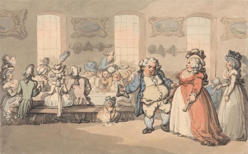 Keywords: Thomas Rowlandson - The Comforts of Bath- The Breakfast - Google Art Project.jpg No inscription Inscription _Signed_and_Dated Not signed not dated Not on View Watercolor with pen and brown-gray and black ink over graphite on medium smooth blued white wove paper; mount border light blue medium slightly textured laid paper; gray and peach wash lines on mount dinner eating people by activity meal breakfast interior men women feathers windows hooks dining hall long tables hats fans genre subject special url_id GAHPkehWBEQ0PQ PD-old-100-1923 1827 Drawings and watercolours by Thomas Rowlandson Google Art Project works by Thomas Rowlandson |