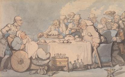 | Keywords: Thomas Rowlandson - Comforts of Bath- Gouty Gourmands at Dinner - Google Art Project.jpg Inscribed on verso center 78 ; in graphite lower right A95 ; in black ink lower left collector's stamp of Sir Bruce S Ingram Lugt 1405a with the initial A underneath Inscription _Signed_and_Dated Not signed not dated Not on View Watercolor pen and gray-brown ink and graphite on medium moderately textured beige wove paper dinner meal servants men feast food chairs wheel chairs crutches drinking vessel genre subject special url_id lAH1cckWM0o-Mw PD-old-100-1923 1827 Comforts of Bath 1798 - drawings by Thomas Rowlandson Google Art Project works by Thomas Rowlandson |