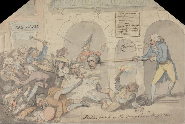 | Keywords: Thomas Rowlandson - Drury Lane. The School for Scandal - Google Art Project.jpg  Inscribed in black ink upper left signage ROSE TAVERN ; in brown ink upper right signage on wall School for Scandal --- --- --- --- --- --- and Charles by Mr Honorble to which will be addes who's the Dupe --- --- --- ; in brown ink center right in bubble Boo---oo---oo-- ; in brown ink lower right Thalia's frolick or the Drury Lane Bug'a'boo ; in black ink verso upper left Wigstead ; in brown ink verso upper center Radishes New Cheese ; in brown ink verso upper right numerical computations ; in graphite verso lower right D-1984; in blue ink verso lower center PAUL MELLON COLLECTION collector's stamp; in brown ink verso center left numerical computations Inscription _Signed_and_Dated Not signed not dated Not on View Watercolor with pen and black gray and brown ink over graphite on moderately thick moderately textured beige laid paper satire head school men women stick archways tavern hats genre subject special url_id BgEdOhN0OtANLg PD-old-100-1923 1827 Drawings and watercolours by Thomas Rowlandson Google Art Project works by Thomas Rowlandson |