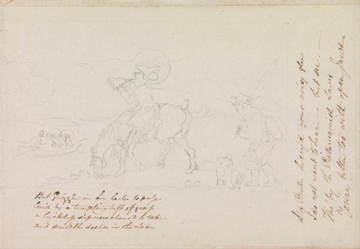 | Keywords: Thomas Rowlandson - Preparatory sketch for 'Dr Syntax Sketching the Lake' - Google Art Project.jpg Inscribed in pen and brown ink lower left But Grizzle in her haste to pass Lur'd by a tempting tuft of grass a luckless slip now chanced to take And sous'd the doctor in the Lake; in pen and brown ink center right Slow Brute he cry'd your noisy glee I do not want to hear - but see - Tho' by Picturesquith Laws you're better too with open Jaws Inscription _Marks watermark similar to Heawood 1340 but with lineux Johnston/ A Lee in mirror image below plumed symbol Inscription _Signed_and_Dated Not signed not dated Not on View Pen and brown ink with graphite on medium slightly textured cream laid paper dog animal horse animal man lake sketch genre subject special url_id 1QGuaFRhRsiipw PD-old-100-1923 1827 Doctor Syntax in Search of the Picturesque - drawings by Thomas Rowlandson 1 16 Google Art Project works by Thomas Rowlandson |