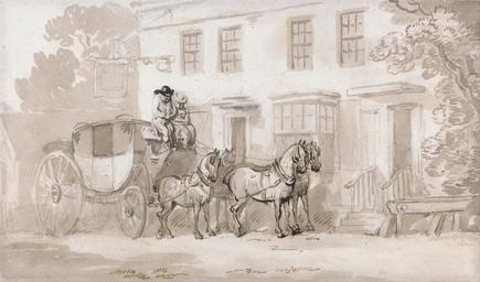 | Keywords: Thomas Rowlandson - A Stage Coach Outside of the Entrance of an Inn - Google Art Project.jpg Inscribed on verso in graphite lower right P7938C 18 ; in graphite on mount lower left DLA 349 Inscription _Signed_and_Dated Not signed not dated Not on View Brown and gray wash with pen and black and brown ink over graphite on medium slightly textured blued white wove paper mounted on moderately thick moderately textured beige laid paper horses animals grass doorway windows wheels stairs inn trees stage coaches genre subject sign special url_id EAGv1ZxsUmrHsA PD-old-100-1923 1827 Drawings and watercolours by Thomas Rowlandson Google Art Project works by Thomas Rowlandson |