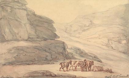 | Keywords: Thomas Rowlandson - Valley of Stones, Lynton, Devon - Google Art Project.jpg Inscribed in artist's hand in pen and dark gray ink lower left Rowlandson ; in pen and dark gray ink; lower right North Coast Cornwall ; in graphite on mount verso on contemporary mount upper center 817 1 Inscription _Marks watermark J WHATMAN / 1813 similar to Shorter 202 Inscription _Signed_and_Dated Not signed not dated Not on View Watercolor with pen and red and gray-brown ink; verso graphite sketch on medium slightly textured beige wove paper set in on contemporary wash mount horses animals rocks cliffs valley landform stones landscape special url_id UQFjHnMNxrBVHw PD-old-100-1923 1827 Drawings and watercolours by Thomas Rowlandson Google Art Project works by Thomas Rowlandson |