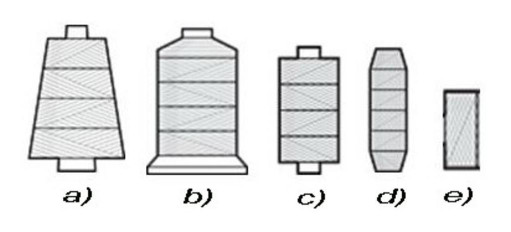 Keywords: Thread bobbins.jpg en Various forms of sewing thread bobbins a Cone b Bottle bobbin c Cylindrical bobbin d Bobbin for embroidery machine e Bottom thread bobbin for lockstitch sewing machine hu Különböző varrócérna-csévék a Kúpos cséve b talpas cséve c hengeres cséve d hímzőgéphez való cséve e alsófonal-cséve huroköltésű varrógéphez own Elkagye 2009-01-19 SVG Bobbins |