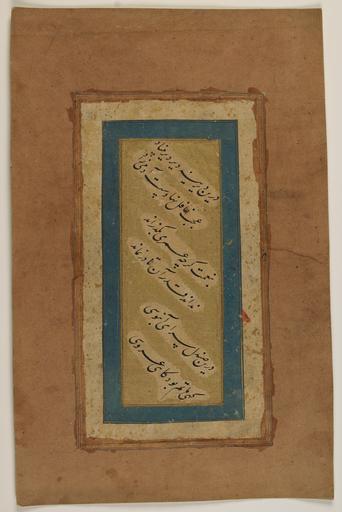 | Keywords: Three Bayts (Verses) on Worldly Desires WDL6859.png Artwork ru Т и бейта стиха о земных желаниях fr Trois bayts versets sur les désirs matériels en Three Bayts Verses on Worldly Desires zh 关于世俗欲 的三个诗节 pt Três bayts versos sobre os desejos mundanos ar ثلاثة أبيات عن الرغبات الدنيوية ru Данный каллиг афический ф агмент включает т и <em>бейта</em> стиха на пе сидском языке в кото ых в стихотво ной фо ме описывается истинное значение жизни В этом д евнем монасты е пост оенном в ста ые в емена / Ст анно что сущностью человека так п енеб егают / Если тебе суждено п овести всю жизнь в богатстве / Ты не узнаешь его ценности пока его не ут атишь / В этом доме из сандалового и че ного де ева / Иногда ца ит т ау а в д угие дни отмечают свадьбу В стихотво ном п оизведении ми п едставлен как д евний монасты ь и дом из сандалового и че ного де ева и кова ен он заби ает то что дает в нем соседствуют адости и печаль Истинную ценность человеческой жизни надо искать не че ез п иоб етение мате иальных ценностей Стихи написаны че ными че нилами ш ифтом насталик на бежевой бумаге и об амлены облакооб азными полосами на золотом фоне Текстовая панель об амлена синей и к емовой каймами ук ашенными золотыми к апинками и немного неакку атно наклеена на больший по азме у лист ко ичневой бумаги с ка тонной подложкой а данном каллиг афическом ф агменте нет ни даты ни подписи Однако возможно что он был выполнен в И ане или Индии в XVIII XIX веках <br>Каллиг афия пе сидская; Иллюмини ование укописей; Пе сидская поэзия; Поэзия fr Ce fragment de calligraphie comprend trois <em>bayts</em> versets de poésie en persan décrivant le vrai sens de la vie dans les versets suivants « Dans cet ancien monastère bâti autrefois / Il est étrange que la subsistance de l'homme soit si négligée / S'il devait passer toute sa vie avec des richesses / Il ne saurait pas leur valeur jusqu'à ce qu'elles soient perdues / Dans cette maison de bois de santal et d'ébène / Il y a parfois un deuil et parfois un mariage » Le poème décrit le monde comme un ancien monastère et une maison de bois de santal et d'ébène Le monde est traître car il reprend ce qu'il donne mais il consiste aussi conjointement en joies et tristesses La vraie valeur de la vue d'un homme doit être recherchée ailleurs que dans l'acquisition de biens matériels Les versets sont exécutés en écriture nastaliq à l'encre noire sur un papier beige Il sont soulignés par des bandes de nuages peintes sur un fond doré Le texte est encadré par des bordures bleues et crème décorées de mouchetures dorées Celles-ci furent collées sans soin sur une feuille plus grande de papier marron renforcée par du carton au dos Ce fragment de calligraphie n'est ni signé ni daté Cependant il pourrait avoir été exécuté en Iran ou en Inde aux XVIII<sup>e</sup>-XIX<sup>e</sup> siècles <br>Calligraphie persane; Enluminures; Poésie persane; Poésie en This calligraphic fragment includes three <em>bayts</em> verses of poetry in Persian that describe the true meaning of life in verses that read In this ancient monastery built in olden days / Strange that man's substance is so neglected / If he were to spend his whole life with riches / He would not know their value until they are lost / In this house of sandalwood and ebony / Sometimes there is mourning at others a wedding The poem describes the world as an ancient monastery and a house of sandalwood and ebony The world is treacherous as it takes back what it gives but also consists jointly of joys and sadness The true value of man's life must be sought elsewhere than in the acquisition of worldly goods The verses are executed in black Nasta'liq script on beige paper and are outlined in cloud bands on a background painted in gold The text panel is framed by blue- and cream-colored borders decorated with gold flecks and somewhat sloppily pasted to a larger sheet of brown paper backed by cardboard This calligraphic fragment is neither signed nor dated However it may have been executed in Iran or India in the 18th 19th centuries <br>Calligraphy Persian; Illuminations; Persian poetry; Poetry zh 这幅书法残卷包含三 <em>bayts</em>(句)波斯语诗歌,描述了生活的 实意义,文中写道: 这个建于昔日的古 修道院里,/奇 的是,人的物质显得如此不重要 /如 他富裕 度过 生,/他不会知道财富的价 ,除 失去它们 / 这个 香和乌 建 的房子里,/ 时( ) 悼声, 时是欢乐的婚礼 这首诗将世界描述成 座古 的修道院和 用 香和乌 建 的房子 世界变化莫测,因为它会把给予的 切全部收回,这既 欢乐,也 悲伤 生命的 正价 必须 获得世俗物质之外寻找 此诗歌以黑色波斯体书写 张米色的纸张上,以带状云彩图案勾勒,背景涂成金色 字幅的 色和奶油色边框装饰 金色斑点, 些随意 粘贴到 张更大的棕色纸张上,背衬 纸 这幅书法残卷既没 署名也没 