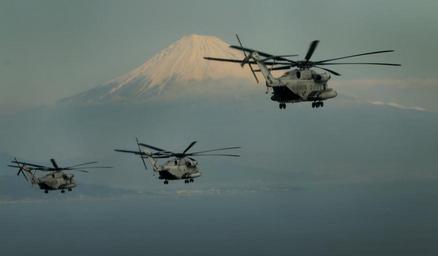 Keywords: Three CH-53E Super Stallion Helicopters fly Mount Fuji flight Misawa Air Base Japan Okinawa mountain snow peak