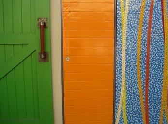 MAKE A MEME View Large Image three panels a green door an orange panel panel blue colorful
