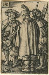 | Keywords: Three Soldiers and a Dog.jpg Beham Hans Sebald 1500-1550 Three Soldiers and a Dog Engraving ca 1540 B 196 P 199 1 7/8 X 1 1/4 inches i/ii before the dots to the right near the clouds A very fine early impression printed strongly with all the details clear Very good condition trimmed on the plate mark but outside the borderline remains of prior hinging verso tiny hairline in image not prominent First state of two Private collection Creator Sebald Beham Scan by Yellow Lion 2006 Reproduction of 2D artwork in public domain Engravings soldiers in art Drawings of dogs Halberds in art Landsknechts Sebald Beham |