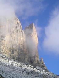 Keywords: three zinnen lavaredo small gargoyle yellow edge rock wall steep wall climbing wall rock dolomite dolomites mountains alpine south tyrol italy rubble field haze cloudy