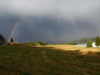 Keywords: thunderstorm dark sky rainbow weather clouds landscape scenery nature british columbia canada hay balls farmland agriculture buildings golden meadow bale countryside