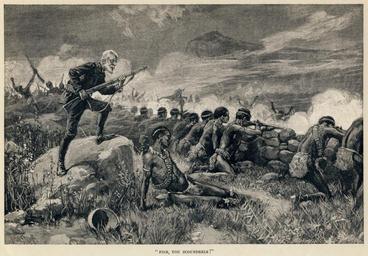 | Keywords: Thure de Thulstrup - H. Rider Haggard - Maiwa's Revenge - Fire, you scoundrels.png wikitable <big>This is the archival version of File Thure de Thulstrup - H Rider Haggard - Maiwa's_Revenge_- Fire you scoundrels jpg Due to a bug in the thumbnailing software large PNGs do not display at the moment; however this is an exceedingly rare image and without this information would be lost to JPEG artefacts It should not under any circumstances be deleted This is the archival version of the cleaned up version; for the original scan see File Thure de Thulstrup - H Rider Haggard - Maiwa's_Revenge_- Fire you scoundrels original scan png</big> Illustration from H Rider Haggard's Maiwa's Revenge Chapter VII by Thure de Thulstrup The scene shows Allan Quatermain ordering the men to fire after getting them to wait until the most opportune moment Now they are going to begin I thought to myself and I was not far wrong for in another minute the body of men divided into three companies each about five hundred strong and heralded by a running fire charged at us on three sides Our men were now all well under cover and the fire did us no harm I mounted on a rock so as to command a view of as much of the koppie and plain as possible and yelled to our men to reserve their fire till I gave the word and then to shoot low and load as quickly as possible I knew that like all natives they were sure to be execrable shots and that they were armed with weapons made out of old gas-pipes so the only chance of doing execution was to let the enemy get right on to us On they came with a rush They were within eighty yards now and as they drew near the point of attack I observed that they closed their ranks which was so much the better for us Shall we not fire my father sung out the captain No ”confound you I answered Sixty yards ” fifty ” forty ” thirty Fire you scoundrels I yelled setting the example by letting off both barrels of my elephant gun into the thickest part of the company opposite to me Harper's New Monthly Magazine Vol LXXVII No 459 26 p 351 1888-08 Creator Thure de Thulstrup 1930 File Thure de Thulstrup - H Rider Haggard - Maiwa's_Revenge_- Fire you scoundrels jpg Restored JPEG File Thure de Thulstrup - H Rider Haggard - Maiwa's_Revenge_- Fire you scoundrels png Restored Archival PNG File Thure de Thulstrup - H Rider Haggard - Maiwa's_Revenge_- Fire you scoundrels original scan png Original scan PNG Minor cleanup levels adjustment crop Henry Rider Haggard Maiwa's RevengeThure de Thulstrup Allan Quatermain 1888 |
