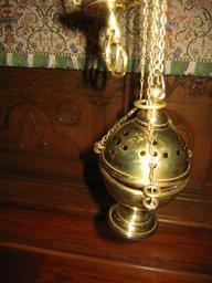 | Keywords: Thurible.jpg This is a brass thurible The top has been lowered to close over the bowl A small brass ring at the top has been lowered over the chains to lock the top The top is locked so that the priest and thurifer the lay person who handles the thurible may swing the thurible without spilling hot coals and incense Lay person see laity In this photo there are no coals or incense so you do not see smoke coming from the thurible But if this were in use during a church service there would be about four hot coals inside and the priest would add incense at several times during the service The thurible hangs from three chains and a fourth chain is attached to the top part of the thurible The thurifer can pull this fourth chain to raise the top so that the priest may add incense to the hot coals See also the photo called incenseboat jpg The incense is carried in this brass object called a boat or incense boat The thurifer can carry the boat in the left hand and thurible in the right hand or a small boy or girl may carry this boat and stay beside the thurifer This person is called a boat boy or boat girl The boat boy/girl stays to the left of the thurifer and has no other duty beyond staying at the left of the thurifer and handing the thurifer the boat when requested Wherever the thurifer goes the boat boy/girl must stay next to the thurifer The thurifer will hold out a hand when he/she wants the boat The boat boy/girl hands the boat to the thurifer and receives it when the thurifer returns it to the boat boy/girl's hand Most boat boys/girls are very young some as young as four years of age They generally range four to seven years of age but this varies church to church This is a photograph that I took which anyone is welcome to copy and use Sarum blue 21 47 14 February 2006 UTC en wikipedia Liftarn CommonsHelper 2006-01-29 Sarum blue wikipedia en Sarum blue Original upload log page en wikipedia Thurible jpg 2006-01-29 03 30 Sarum blue 480×640× 266666 bytes <nowiki>This is a brass thurible The top has been lowered to close over the bowl A small brass ring at the top has been lowered over the chains to lock the top The top is locked so that the priest and thurifer the lay person who handles the thurible may swin</nowiki> Thuribles |