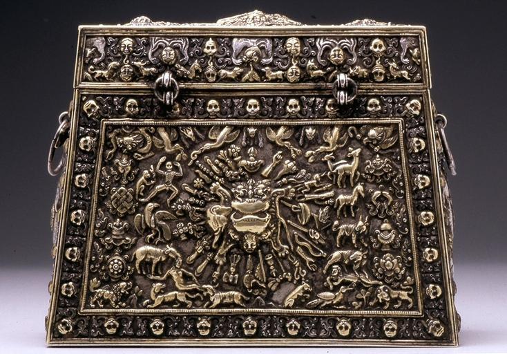 Keywords: Tibetan - A Ritual Box - Walters 572299 - Reverse.jpg The surfaces of this silver and gilt box are richly embellished with symbols and mantras associated with the destruction of malevolent spirits On the front is a symbolic representation of the protective female deity Lhamo The precise function of the box within a ritual context is unknown but it may have served as a storage container for other esoteric objects used within a tantric ritual The inclusion of skulls as border motifs and the manacled creatures at either end are suggestive of both protection of the contents and the use of the box in purifying rites or exorcisms The inscriptions include spells using Sanskrit words and Tibetan curses such as May its voice sink in darkness and dissolve Part of the ritual seems to have involved capturing the spirit and part subduing it There may also be references to yogic activities such as controlled-breathing exercises The complexity of the decoration is indicative of a date in the 18th century making this a relatively late example of the Tibetan tantric tradition century 18 silver with gilding and turquoise cm 30 5 30 5 15 2 accession number 57 2299 23140 Kathmandu Nepal date and mode of acquisition unknown John and Berthe Ford Baltimore Winter 1983 by purchase Walters Art Museum John Berthe Ford 2007 Desire and Devotion Art from India Nepal and Tibet in the John and Berthe Ford Collection The Walters Art Museum Baltimore; Birmingham Museum of Art Birmingham; Santa Barbara Museum of Art Santa Barbara; Albuquerque Museum Albuquerque 2001-2003 place of origin Tibet Walters Art Museum license Tibetan art in the Walters Art Museum Metalwork of Tibet Silver boxes Exorcism |