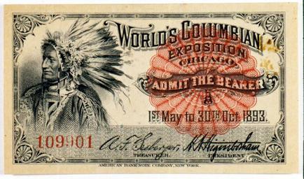 | Keywords: world's columbian exposition worldscolumbianexposition ticket world's fair worldsfair 1893 chicago illinois white city whitecity commons:event=commonground2009 Portrait of Native American with feather headdress. Admit the Bearer. 1st May to 30th October, 1893. Ticket from World's Columbian Exposition Chicago. Printed by American Bank Note Company, New York. Digital Identifier: GN86844_6c Original material: 35mm color slide Date photo taken: 1993 World's Columbian Exposition Collection at The Field Museum Portrait of Native American with feather headdress. Admit the Bearer. 1st May to 30th October, 1893. Ticket from World's Columbian Exposition Chicago. Printed by American Bank Note Company, New York. Digital Identifier: GN86844_6c Original material: 35mm color slide Date photo taken: 1993 World's Columbian Exposition Collection at The Field Museum |