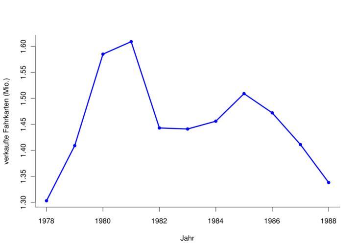 | Keywords: Ticketverkäufe Freiburg Hauptbahnhof 1978–1988.svg en Tickets sold at Freiburg Hauptbahnhof de Anzahl der verkauften Fahrkarten am Freiburger Hauptbahnhof inklusive der Haltepunkte Basler Straße Zähringen und Herdern own El Grafo 2010-02-28 Created with R History of Freiburg Hauptbahnhof Files by User El Grafo Data save as data csv <pre> year tickets 1978 1303000 1979 1409000 1980 1585000 1981 1609000 1982 1443000 1983 1441000 1984 1456000 1985 1509000 1986 1472000 1987 1411000 1988 1338000 </pre> R-code <pre> read data read the original time-series this one is needed for the dashed grey line connecting all the dots data <- read csv data csv sep data 2 <- data 2/1000000 devide data by 1000000 to get millions on the y-Axis attach data plotting un-comment for svg-output svg file test svg width 10 height 7 note this may not work on MS Windows try Cairo instead par cex 1 2 plot the blue lines plot tickets ~ year type l col blue xlab Jahr ylab verkaufte Fahrkarten Mio bty l lwd 3 add the dots points tickets ~ year pch 16 col blue un-comment for svg-output dev off </pre> |