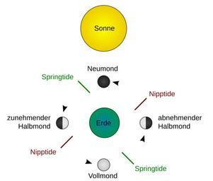 | Keywords: Tide schematic de.svg de Schematische Darstellung der Tiden en Tides schematic Due to the bathymetry of some areas neap and spring tides reach their maximum force 2 days after the first quarter moon third quarter moon and new moon full moon respectively In the absence of complications due to bathymetry spring tides are exactly at the full and new moons and neap tides are exactly at the one-quarter and three-quarter moon Every six hours the water also lowers or heightens; as such four tides are created <br>Low water spring tide<br/> High water spring tide<br/> Low water neap tide<br/> High water neap tide<br/> Tide schematic svg 50 2013-08-09 23 02 UTC Tide schematic svg KVDP SVG conversion by Surachit derivative work Furfur Other fields A 45 + Diagrams German translation minor edits Furfur Tide schematic svg Tides |