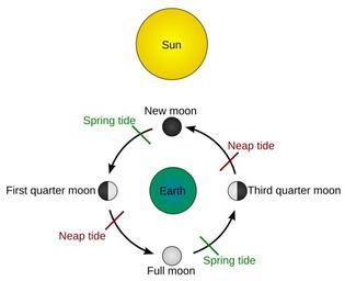 | Keywords: Tide schematic.svg en Tides schematic Due to the bathymetry of some areas neap and spring tides reach their maximum force 2 days after the first quarter moon third quarter moon and new moon full moon respectively In the absence of complications due to bathymetry spring tides are exactly at the full and new moons and neap tides are exactly at the one-quarter and three-quarter moon Every six hours the water also lowers or heightens; as such four tides are created Low water spring tide<br/> High water spring tide<br/> Low water neap tide<br/> High water neap tide 2009-10-06 Public domain image File Tides schematic JPG which was based on an image in Leidraad voor het Stuurbrevet by Richard Vooren Paul Van den Keybus User KVDP SVG conversion by Surachit Other versions <gallery> Esquema-mareas svg language es Tide schematic de svg language de Tide schematic mk svg language mk </gallery> Original jpg drawing File Tides schematic JPG Other fields + Diagrams Tides Tides |