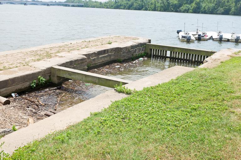 Keywords: Tidewater lock, downstream (outlet) gate pocket detail.jpg en Tidewater lock on Chesapeake and Ohio Canal detail of gate pocket downstream Potomac River and Roosevelt Bridge are in the background own Bonnachoven 38 899958 -77 057761 Chesapeake Ohio Canal National Historical Park Potomac River Cc-zero |